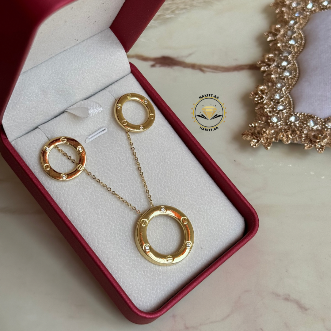 Ovaj sofisticirani set se sastoji od zlatne narukvice i ogrlice s privjeskom u modernom, minimalističkom obliku koji odiše luksuzom i jednostavnošću.